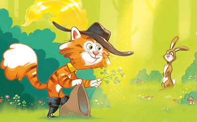 Así, el gato tomó sus botas y se las encasquetó y saco en ristre salió hacia el bosque.